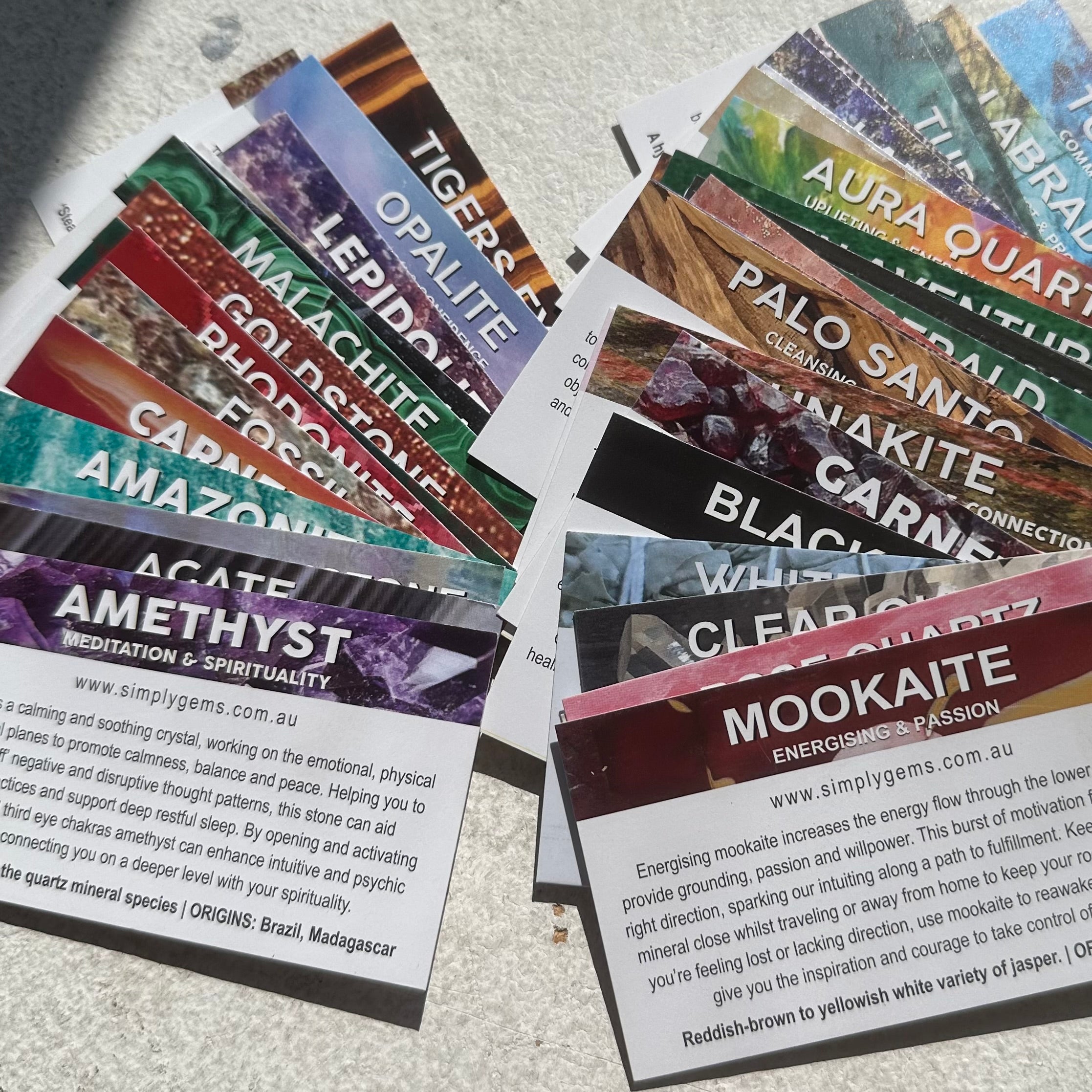 Assorted crystal information cards. Please refer to pictures for details. All 50 cards will be of different crystals, one each.